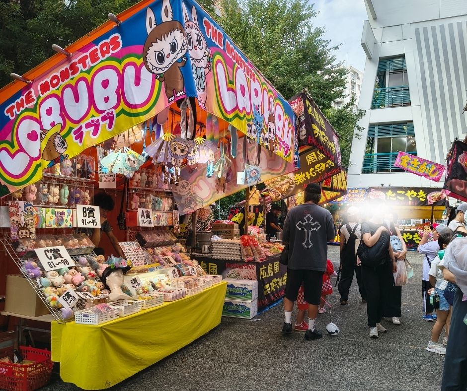 At festivals, there are lots of shops called yatai (food stalls)…. and guess what, “ラブブ” Recently, bubble tea has been popular, but honestly, it was the first time I saw it at a festival stall (lol). Usually, the classic stalls are things like yakisoba, shaved ice, takoyaki, and cotton candy!
