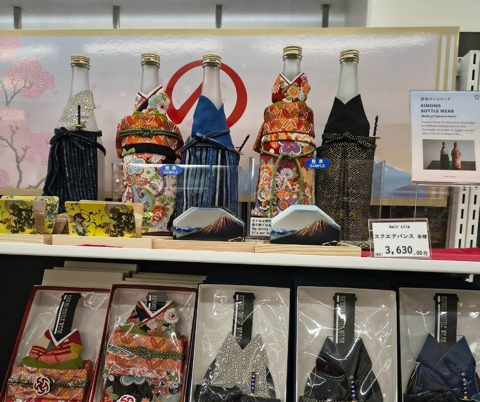 それからこれもコンビニで見つけました!着物のボトルケースです!いろいろなデザインがあってとてもきれいでしたよ!お酒が好きな人はこれに日本酒を入れてみてはどうでしょうか?😊