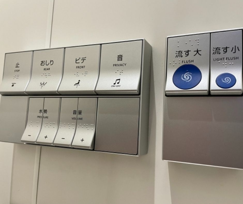 ボタンがたくさんあります。たとえば、あたたかいシートやウォシュレット(おしりをあらみず)、フタが自動じどういたりまったりするなど、いろいろな機能きのうがあります!とてもかいてきで、きれいです🌟「TOTO」は世界的せかいてきにも有名ゆうめいですね😊
