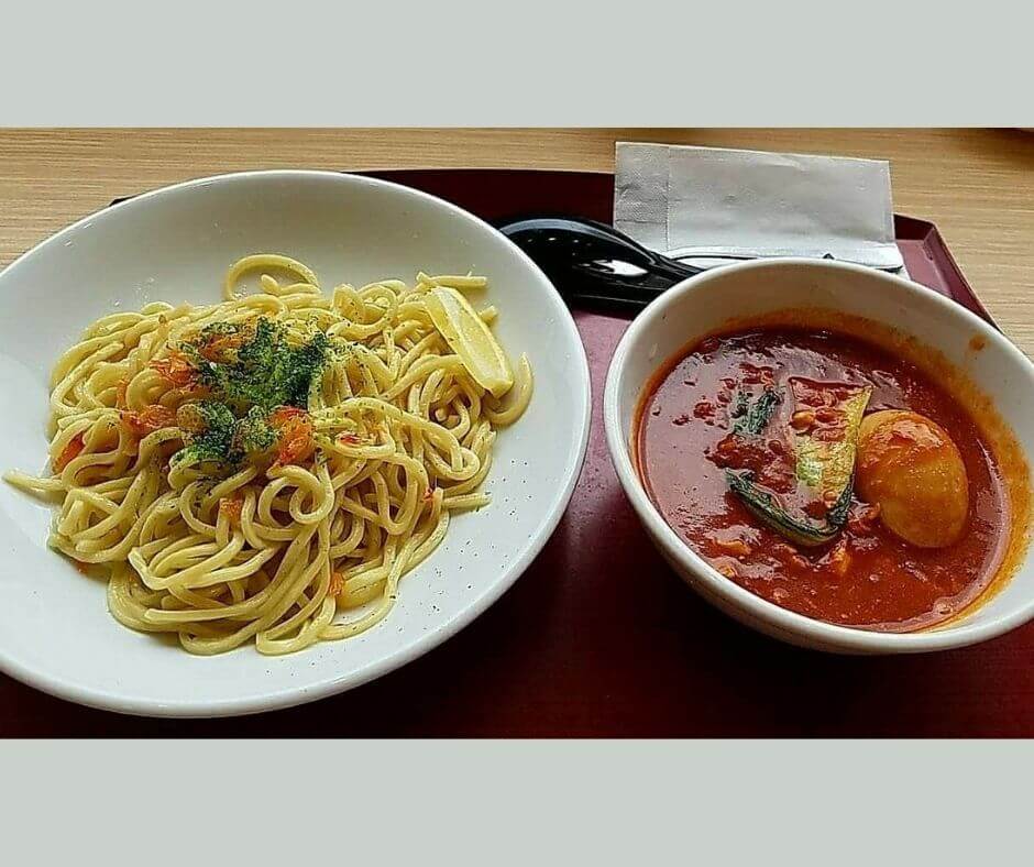 まず「つけナポリタン」!ナポリタンは、日本にほん人気にんきのパスタで、ケチャップで味付あじつけをします。ハムやソーセージ、たまねぎ、ピーマンなどがはいっていて、すこあまくてべやすいあじです。そのナポリタンをスープにつけてべるのが、富士市ふじしスタイル!わたし中学生ちゅうがくせいときあたらしいメニューとしてできました!